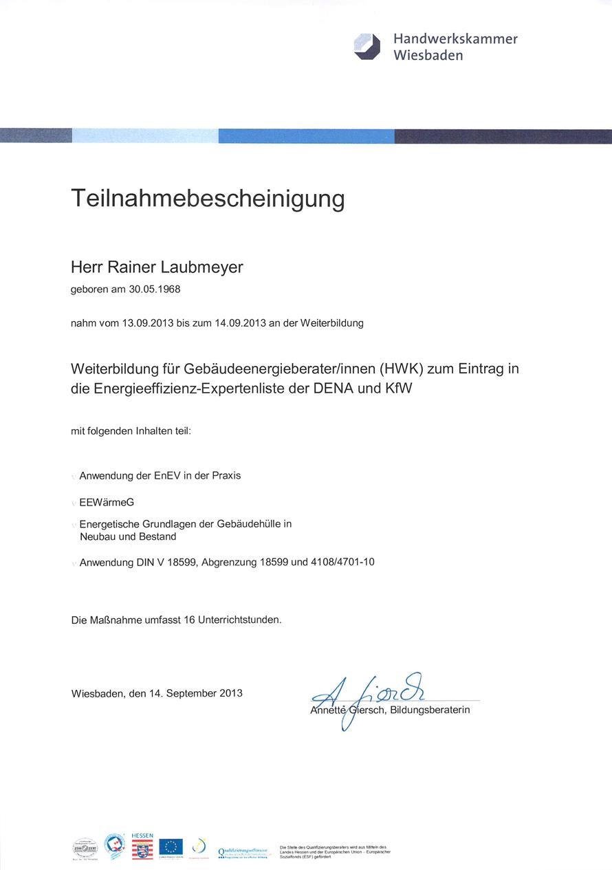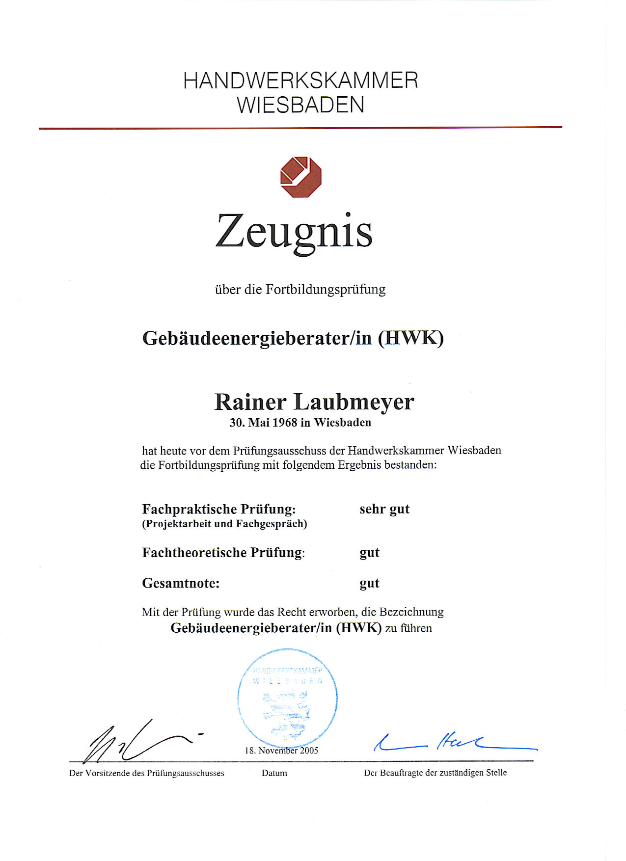 Bei der energetischen Sanierung ist es Wichtig sich mit dem Thema umfassend zu beschäftigen. Aus diesem Grund habe ich mich zum Energieberater im Handwerk weitergebildet. Von mir bekommen sie nicht einfach ihr Haus "isoliert" ich helfe Ihnen die für Ihr Objekt und Ihre Ziele geeigneten Maßnahmen zu ergreifen.